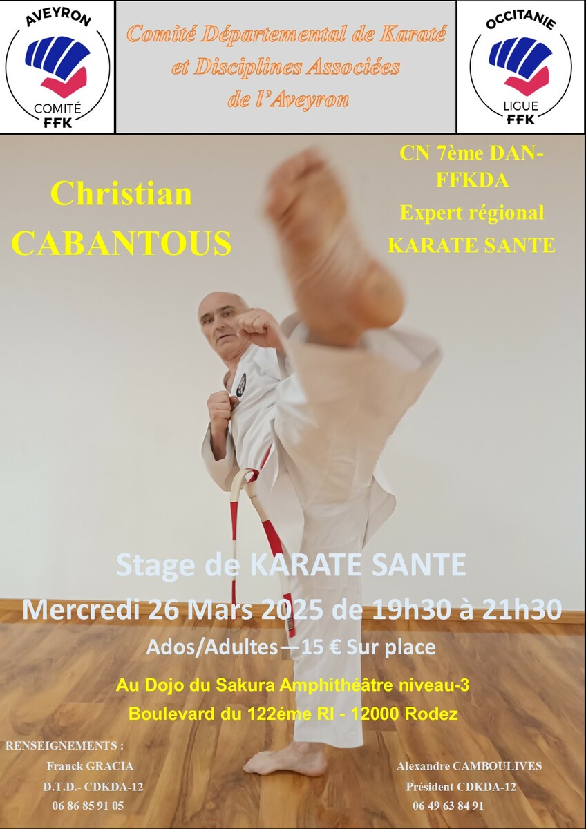 Stage karaté santé dirigé par Christian Cabantous CN 7éme DAN expert régional organisé par le CDKDA 12 au dojo du Sakura à Rodez le Mercredi 26 Mars 2025 de 19h30 à 21h30